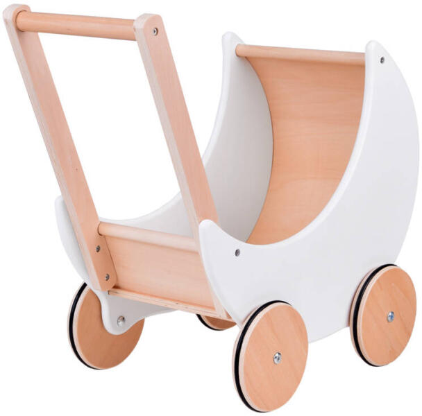 A babákkal való játék egy gyönyörű játék, amelyet minden kislány szeret. A szórakozás mellett azonban számos lehetőséget biztosít a gyermek növekedéséhez, fejlődéséhez. Azáltal, hogy úgy vigyáznak a babára, mintha saját gyermekük lenne, a lányok közelebb kerülnek a felnőttek világához, kipróbálják, mit hoz az anya élete. Ez a csinos, fából készült babakocsi minden kislányt elragad majd, aki szeret babákkal és puha játékokkal játszani. A babakocsi ideális játék kisgyermekek számára, akik most kezdik megtenni az első lépéseket. Természetes fából készült, ötvözi az egyszerűséget, a tartósságot és a biztonságot. Minimalista dizájnja minden belső térbe tökéletesen illeszkedik, masszív felépítése pedig stabilitást biztosít, így könnyebben tanul meg járni. A babakocsi kerekeit gumi védi, amely védi a padlót a karcolásoktól és egyben csendes, biztonságos utazást biztosít. Ergonomikus fogantyú a gyermek kis kezéhez igazítva, amely segíti az egyensúlytanulást. A babakocsi kosárként is használható játékokhoz vagy egyéb gyermekfelszerelésekhez. Minden él gondosan le van kerekítve és le van marva a teljes biztonság érdekében játék közben. Minden kismama beleszeret ebbe a babakocsiba. Jellemzői:- tartós, esztétikus és funkcionális, a gyermek fejlődését támogató játék- gondosan lekerekített élek- a szilárd felépítés biztosítja a stabilitást