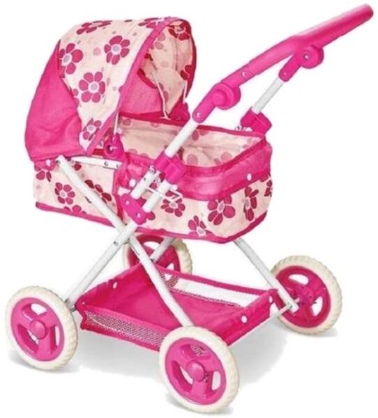 Retoys Összecsukható babakocsi mózeskosárral - rózsaszín Ajánlott 3-6 éves korig lányoknak [Cikkszám 03109]Retoys összecsukható babakocsi mózeskosárral - rózsaszín A Retoys rózsaszín összecsukható babakocsi mózeskosárral ideális választás, ha játékbabád számára szeretnél egy kényelmes és stílusos utazási megoldást. Ez a babakocsi nemcsak esztétikailag vonzó, de funkcionálisan is praktikus. A robusztus fémváz biztosítja a stabilitást, míg a puha mózeskosárban a kisbaba valóban luxusban érezheti magát. A mózeskosár teteje árnyékolóval van felszerelve, amely megvédi a babát az erős napsütéstől, lehetővé téve a zavartalan játékot a szabadban. A babakocsi tervezésénél fontos szempont volt a funkcionális kényelem is. A mózeskosár kényelmesen elérhető magasságban, 37 cm-en helyezkedik el a földtől, így könnyen hozzáférhető. A fogantyú magassága 38 cm-től 67 cm-ig állítható, így a kicsik különböző méreteihez is alkalmazkodik, maximálisan 45 cm-es babaméretig használható. Az egyszerűen összecsukható kialakítás pedig megkönnyíti a tárolást és a szállítást. Ajánlott 3-6 éves korig lányoknak.